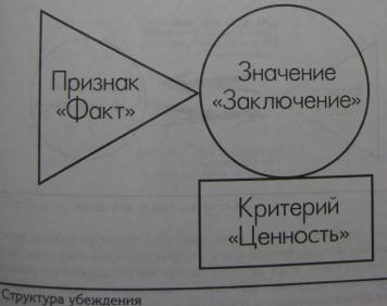 Впрочем, убеждения в отношении высших сил, традиционно обозначаемые словом «вера», в НЛП интерпретируются таким же самым образом, как и убеждения в отношении обычных земных явлений. Наша модель мира является системой убеждений. НЛП предполагает, что наши убеждения определяют наши возможности и поведение. Другими словами, то, что мы можем и что мы делаем, в некоторых случаях оказывает влияние на то, что мы думаем, но часто и не оказывает. С другой стороны, то, что мы думаем, определенно, оказывает влияние на то, что мы можем и что мы делаем, так как мы используем свои убеждения для того, чтобы организовать свои возможности и поведение. Убеждения, как и другие виды субъективного опыта, имеют структуру. Эта структура состоит из едва различимых отличий в параметрах внутренних образов, звуков и чувств (субмодальностей). Иными словами, опыт «состояния убежденности в чем-либо» находится во взаимосвязи с определенным родом образов, звуков и чувств, возникающих внутри нас. По сути дела, это позволяет обнаружить точки соприкосновения для изменения убеждений. Представим себе, что состояние убеждения сопровождается у человека сильным особым ощущением в области желудка и яркими, четкими визуальными образами. Таким образом этот человек может ослаблять определенные убеждения, приглушая ощущение в области желудка и делая образы более расплывчатыми. С вещами же, в которые он хочет поверить, он может проделывать обратное. Наряду с субмодальной структурой убеждение имеет также структуру в отношении: (а) причин и «фактов», говоря в общем смысле, признаков, (б) ценностей и значений, говоря в общем смысле, критериев, и (в) заключений или (субъективно выявленных) результатов, говоря в общем смысле, значений.
