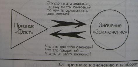 Представим себе, что некто убежден в том, что «людям вообще никогда нельзя доверять». Если этот человек выскажет это убеждение вслух, тем самым он сформирует заключение, значение. Он высказывает обобщение на основании некоторого (возможно большого) числа впечатлений от общений людьми, когда его доверие было обмануто. На каких же именно впечатлений основывается это обобщение (значение)? Что именно произошло, в результате чего он пришел к такому заключению? Если я задам ему вопрос: «Откуда ты знаешь, что людям вообще никогда нельзя доверять?» или: «Как это случилось, что ты так считаешь?», я верну его мысли к этим переживаниям. Таким образом я узнаю что-то об одном недостающем элементе в структуре, а именно, те признаки, на которых основывается значение. Возможно, он скажет: «Моя мать позволяла моему отчиму жестоко обращаться со мной, а мой сын уже двенадцать лет не обращает на меня внимания». Теперь я могу попробовать заполнить второй элемент, а именно, критерий. К примеру, я спрошу «Что ты при этом предпринимаешь?». Это будет означать: «Доверяешь ты людям или не можешь им доверять?». При этом я пытаюсь выявить ценность, критерий, в соответствии с которым определяется важность данного значения. Вероятно, я получу ответы, на основании которых будут выявлены такие критерии как безопасность, справедливость, предсказуемость и хорошие отношения.