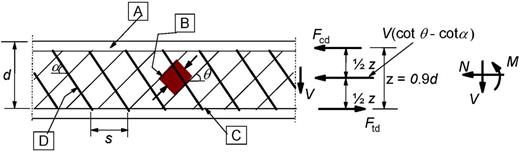 где Aswfywd — сопротивление поперечной арматуры, которая пересекает наклонную трещину между нагруженными зонами (рисунок 6.6). Необходимо учитывать только поперечную арматуру в средней зоне длиной 0,75 av. Понижение с помощью коэффициента b должно применяться только при расчете поперечного армирования. Это действительно только тогда, когда продольная арматура полностью заанкерена на опоре.