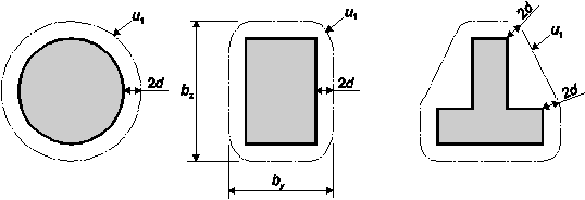 B — горизонтальная проекция (1) Основной контрольный периметр u 1 может быть, в общем случае, принят на расстоянии 2,0 d от площади нагружения и должен быть построен таким образом, чтобы его длина была минимальной Полезная (рабочая) высота плиты принимается постоянной и может быть рассчитана следующим образом: