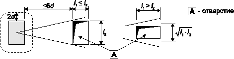 где dy и dz — полезная высота для арматуры в двух ортогональных направлениях. (2) Контрольные периметры на расстоянии менее 2 d необходимо рассматривать, если сосредоточенной силе противостоит высокое давление (например, давление грунта на фундамент) или эффекты от нагрузки, или реакции в пределах расстояния 2 d от края площади приложения силы. (3) Для площадей приложения нагрузки вблизи отверстий, если наименьшее расстояние между периметром площади приложения нагрузки и краем отверстия не превышает 6 d, рассматривается как неэффективная та часть контрольного периметра, которая расположена между двумя касательными, проведенными к отверстию из центральной точки площади приложения нагрузки (рисунок 6.14). (4) Для площади приложения нагрузки, расположенной вблизи края или свободного угла, контрольный периметр необходимо принимать согласно рисунку 6.15, если это дает периметр (за исключением свободного края) меньший, чем периметры, определенные в (1) и (2).