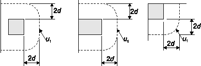 Рисунок 6.15 — Основные контрольные периметры для площадей приложения нагрузки вблизи края или угла (5) Для площадей приложения нагрузки, расположенных вблизи края или угла, т. е. на расстоянии менее d необходимо всегда предусматривать специальную краевую арматуру, см. 9.3.1.4. (6) Контрольное сечение расположено по контрольному периметру в пределах полезной высоты d. Для плит постоянной толщины контрольное сечение перпендикулярно к срединной плоскости поверхности плиты. Для плит или фундаментов переменной толщины (за исключением ступенчатых фундаментов) полезная высота может быть принята как высота по периметру площади приложения нагрузки, как показано на рисунке 6.16. (7) Другие периметры, ui, внутри и снаружи основной контрольной площади должны иметь такую же форму, как основной контрольный периметр.
