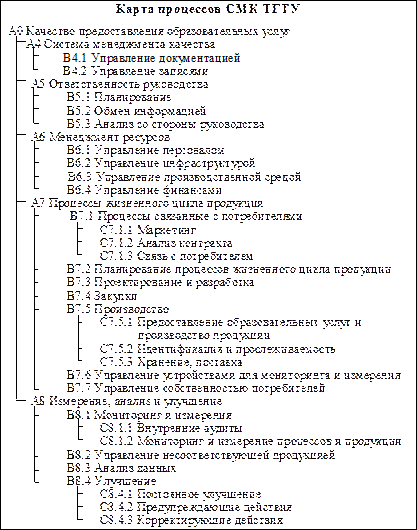 Первую команду, обеспечивающую руководство разработкой и внедрением системы менеджмента качества и определение стратегии организации в области качества, в которую входят высшее руководство и представитель руководства по качеству, возглавляет генеральный директор. В состав команды входят также главный экономист (руководитель планово-финансового управления), главный бухгалтер, начальник производственного отдела, специалисты по маркетингу и другие специалисты организации. Эта команда ответственна за организацию изучения стандартов ИСО серии 9000 версии 2008 года руководителями, специалистами, а также за последующее использование в деятельности организации восьми принципов менеджмента качества, изложенных в [6,16]. Особое внимание следует уделить разработке системы стимулирования и мотивации персонала, вовлечению сотрудников в деятельность по внедрению системы менеджмента качества. Эта команда формирует цели разработки и внедрения систем менеджмента качества, разрабатывает программу работ и доводит ее до сотрудников организации через руководителей подразделений и уполномоченных по качеству в подразделениях. В дальнейшем первая команда осуществляет оперативное руководство всей работой, контролирует выполнение программы работ, при необходимости разрешает конфликтные и спорные вопросы. Согласно ГОСТ Р ИСО 9004-2010 [16] Политику в области качества рекомендуется увязывать с общей стратегией организации. Поэтому одним из основных результатов работы этой команды является определение стратегии организации, а также подготовка, опубликование и последующая корректировка Политики и целей в области качества. Вторая команда, возглавляемая техническим директором (главным инженером), предназначена [32, 33] для выделения и описания основных бизнес-процессов организации и для идентификации процессов системы менеджмента качества в соответствии с рекомендациями [16] и требованиями [23]. Команда комплектуется из руководителей организации и начальников подразделений (цехов, отделов, служб), ответственных за соответствующие этапы (фазы) жизненного цикла продукции: - маркетинг и изучение рынка; - проектирование и разработка продукции; - планирование и разработка процессов; - закупки (материально-техническое снабжение); - производство и предоставление услуг; - проверки и контроль качества и т.д. Для идентификации процессов системы менеджмента качества, в состав команды входят руководители и специалисты, ответственные за соответствующие процессы внедрения систем менеджмента качества, в частности, представитель руководства по качеству, начальник отдела управления качеством, начальники подразделений. При описании порядка внедрения процессов системы менеджмента качества команда последовательно выполняет следующие действия [32-34]: · идентификация процессов, в том числе присвоение процессам наименования; · назначение владельцев процессов; · идентификация входов, выходов, ресурсов и управляющих воздействий процессов системы менеджмента качества; · определяется последовательность и взаимодействие процессов. Ниже, в качестве примера, приведена карта процессов (рис. 7.3) системы менеджмента качества Тамбовского государственного технического университета (ТГТУ), идентифицированных [32] на этапе предварительного исследования процессо