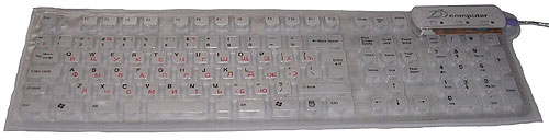 Продукт можно без преувеличения назвать уникальным. Конструктивная особенность данной клавиатуры — использование в качестве основы не обычной «доски», а мягкой резиновой основы. Кнопки также сделаны «мягкими» (прорезиненное покрытие, плюс специально адаптированная система хода клавиш). В итоге мы получаем клавиатуру, которая не боится пыли, грязи, кофе, пролитого сока и прочего, что вам удастся пролить или насыпать на нее. Как видим, плюсов у устройства предостаточно.