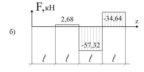 5. Будуємо епюру поперечних сил починаючи з лівого кінця балки (Рис.4.б) (напрям осі Yприйнято за позитивний). 6. Будуємо епюру згинальних моментів (Рис. 4.в). Побудову також починаємо з лівого краю, де прикладений момент M= 40 кНм. Використовуємо правило знаків: «момент, який згинає балку опуклістю до гори, вважаємо від’ємним і навпаки». Поперечні перерізи балки позначимо номерами: 1, 2, 3, 4, 5. - Ділянка балки між перерізами 1 і 2 навантажена моментом M= 40кНм. - Переріз 3 навантажений згинальним моментом M3 = M + RAY· l = 40+2,68·2=45,36 кНм. - Переріз 4 навантажений згинальним моментом M4 = M + RAY 2· l –F1 l = 40+2,68·2·2-60·2 = -69,28 кНм. - Переріз 5 навантажений нульовим згинальним моментом.