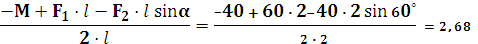 3. Рівняння рівноваги мають вигляд: Σ FZi=0; RAZ – F2cosα = 0 (1) Σ MA = 0; –M – F1· l + RBY 2· l – F2 3· l sinα = 0 (2) Σ MB= 0; –M – RAY 2· l + F1· l – F2· l sinα = 0 (3) 4. Розв’язуємо рівняння: RAZ = F2cos α = 40cos60˚ = 20кН RBY = RAY = Перевірка:Σ Fy =0 = RAY – F1 + RBY – F2 sin α = 2,68–60+91,96–34,63