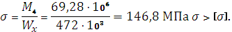 7. Небезпечним, де діє максимальний за модулем згинальний момент є переріз 4 (M4 = 69,28 кНм.)