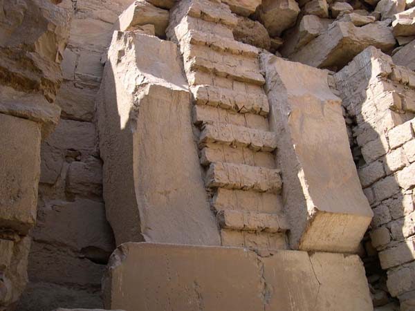 Версия первая. У пирамид было все-таки древнее ядро. У пирамиды Сахура точно есть, у Ниусера и Нефериркара – с большой долей вероятности. Фараоны только насыпали сверху груды щебенки на древние постройки. Исходные конструкции не были рассчитаны на такую нагрузку и в конце концов обрушились. Версия вторая. Все три фараона лишь пытались подражать древним строителям. В пользу этого говорит общий элемент: во всех пирамидах коридор не заглубляется, а идет почти горизонтально. Рабочие фараонов попытались поставить большие блоки в качестве перекрытий. Но мастера понятия не имели о тех знаниях, которые использовались в древних сооружениях, поэтому наделали массу ошибок. В том числе: между слоями перекрытия появились излишние прослойки осколков известняка, которые рабочие просто подкладывали под «висящие в воздухе» блоки (впрочем, тут может быть и ошибка тех, кто составлял планы по уже полуразрушенному виду внутренних конструкций)… Но… При Сахуре, как и при Ниусере и Нефериркаре, подобные большие блоки не изготавливали. Египетские мастера использовали лишь уже готовые блоки, взятые с более древней конструкции!.. Откуда они могли их взять?.. Например, в постройках типа той, что находится совсем рядом. * * * Буквально в нескольких десятках метров от пирамиды Ниусера находится объект, который обозначается на схеме весьма скромно – «мастаба Птахшепсеса». Птахшепсес – чиновник времен фараона Ниусера. Снаружи видны только стены и колонны храма, которые не предвещают на первый взгляд ничего интригующего. И мы бы прошли мимо – подобных руин в Египте очень много… Но помогли вездесущие добровольные помощники, которые в надежде на даже очень небольшой «бакшиш», готовы всегда показать что-то, что могло бы заинтересовать праздного туриста. Так произошло и здесь… То, что мы увидели в этой «мастабе», не просто нас поразило. Скорее, ошеломило. Эффект усиливался еще и явным несоответствием увиденного тому жалкому облику, который имели пирамиды рядом.