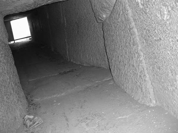 Помимо бури эмоций объект дал и массу информации для размышлений. Прежде всего: помещение, где располагаются «саркофаги», и вход в него сложены из мегалитических блоков. Но если в пирамидах такие размеры перекрытий еще можно пытаться объяснить необходимостью удержания веса верхних слоев пирамиды, то здесь-то в них нет абсолютно никакой необходимости!!! Выше перекрытий никакого серьезного веса нет, не было, и явно даже не планировалось!.. Вот откуда Ниусер мог забрать для своей пирамиды готовые тщательно обработанные прочные блоки. Большая часть перекрытия, которое явно имелось в давние времена, ныне отсутствует, а от некоторых блоков остались в лучшем случае лишь небольшие обломки. (Очередная несуразность официальной версии: приписывая «мастабу» Птахшепсесу, египтологи абсолютно не смутились тем, что чиновник смог позволить себе «погребение» гораздо лучше, чем фараон!..) Но даже разобранное частично помещение все-таки использовалось повторно (что же пропадать добру). Об этом говорит кладка из мелких камней, явно положенная уже позже строительства – между остатками блоков перекрытия и в других местах… Любопытная деталь: в «Энциклопедии Древнеегипетской Архитектуры» указывается, что «мастаба» имела несколько периодов постройки. Но это говорится обо всем комплексе (с пристроенными храмами, культовыми помещениями и т.п.). Часть сооружения с мегалитической кладкой также обозначена, как относящаяся к первому этапу строительства. Однако никаких указаний на то, кто именно осуществлял разные этапы строительства, и какое время разделяет эти два этапа, нет. Различие между стилями, использованными материалами и технологиями обработки камня и строительства настолько велики, что египтологи не могли его не отметить и не сделать очевидного вывода. Но далее этого не пошли. Догмат не позволил… Естественно, мы устремились к «саркофагам». Но по дороге к ним нас поджидал еще один сюрприз: знакомый «стандартно-метровый» нисходящий коридор (Рис. 74)!!!