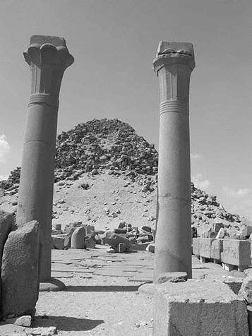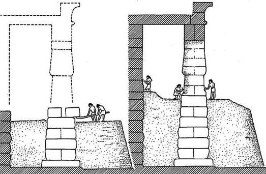 Рис. 110. Схема сборки колонн («Энциклопедия Древнеегипетской Архитектуры») В общем, никакого особого шедевра инженерного искусства подавляющее большинство колонн Древнего Египта из себя не представляют. Как не представляют из себя чего-то невозможного для примитивных технологий древних египтян времен фараонов. * * * А вот с гранитными колоннами далеко не все так просто. Прежде всего, они уже не из «полуколечек» и даже не из «колечек», а цельные. И по качеству изготовления они разнятся. Например, колонны в Римском театре в Александрии хоть и должны были вызывать благоговение перед величием Римской Империи, сделаны отнюдь не идеально. Посмотрев вдоль колонны, легко замечаешь, как ее край слегка «гуляет» вокруг воображаемой прямой, к которой стремились мастера, изготовившие эту колонну. Совсем другое дело – колонны, которые относят к периоду Древнего Царства. Их не так много, но они есть. И вполне способны заставить поломать голову. Например, колонны в Абусире, которые стоят в одном из так называемых «храмов» и рядом с ним. Сам «храм» считается творением фараона V династии Сахура, хотя в ходе его осмотра у нас возникли довольно большие сомнения в правильном определении египтологами авторства данного сооружения. Но к самому храму мы вернемся позже, когда речь зайдет о технологиях древних богов, а сейчас поговорим о самих колоннах…