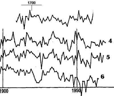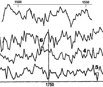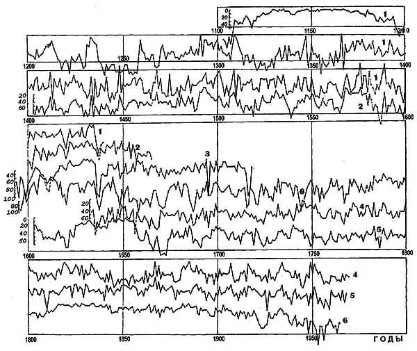 Читаю и чувствую: дурят меня где-то... Но где?.. Ясно, что г-жа Ершова малость поэтизирует описание. Однако даже скидка на поэтизацию не снимает внутреннего дискомфорта. Ну как бы замечательно кольца деревьев не «фотографировали» внешние условия, все-таки далеки они от видеокамеры, позволяющей столь точно восстанавливать события прошлого, как это описывает г-жа Ершова!.. А тут еще хвалебные дифирамбы в адрес дендрохронологии со стороны радиоуглеродного метода, анализ которого приведен выше... В общем: накипело... И как раз в той степени, чтобы взяться за рутинную и очень нудную работу по обсчету нескольких тысяч пар точек кривых дендрошкал... (Вот почему никто и не берется за анализ корректности и надежности дендрохронологических работ!..) Итак, я провел маленький «эксперимент». Идея его была проста: взять несколько «бревнышек» и попытаться их датировать по абсолютной дендрошкале в соответствии с описываемой методикой. Для этого я взял первую попавшуюся под руку подробную дендрошкалу из статьи В.Дергачева «Точные хронологические шкалы протяженностью свыше 10 тысяч лет и «статистическая хронология» А.Т.Фоменко». (Опять Фоменко!.. Не к ночи будь упомянут...) Вот цитата из этой статьи: «В качестве примера рассмотрим применение дендрохронологического метода для датировки деревянных сооружений заполярного города Мангазеи (66o36' c.ш. и 82o16' в.д.) (Шиятов С.Г. 1972), который сыграл большую роль в первоначальном освоении Сибири. Город был заложен в низовьях реки Таз в 1601 году и оставлен в 1672 году. С тех пор на территории Мангазейского городища постоянных поселений не существовало. От прежних деревянных зданий и сооружений остались самые нижние 3-5 венцов, древесина которых, погребенная в землю в слой вечной мерзлоты, большей частью хорошо сохранилась. Шиятов С.Г. для определения времени постройки брал из наиболее сохранившихся бревен по несколько срезов (всего было взято 185 срезов из различных сооружений). По этим данным была построена «плавающая» шкала, датировка которой осуществлялась методом перекрестного датирования по графикам годичного прироста. Наличие в срезах довольно значительного количества колец (не менее 150) и знание промежутка времени существования Мангазеи намного облегчали датировку. Абсолютная дендрохронологическая шкала за 867 лет (с 1103 по 1969 гг.) была построена перекрестным наложением шкал древней древесины и по найденным в районе Приобского Севера и в окрестностях Мангазеи ныне живущим старым деревьям - лиственницам и елям, внутренние кольца которых образовались еще до основания города. В самой верхней части (кривые 1-3) приведены индексы прироста древесины лиственницы из мангазейских сооружений, а в нижней (кривые 4-6) – индексы прироста этих живущих деревьев за время с 1597 по 1969 гг. Правильность абсолютной датировки подтвердилась также известными по историческим документам датами постройки некоторых сооружений, древесина из которых была использована в настоящем исследовании». А вот и сама дендрошкала (в целях сокращения объема файла я малость уменьшил здесь размеры рисунка, что отразилось, естественно, в худшую сторону на иллюстративности точности шкалы, но уж очень громоздок рисунок в оригинале; хотя для математического обсчета использовался как раз оригинал без изменений):