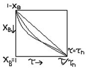 II – переходной участок (промежуточные процессы между I и III). III – температурная зависимость слабая, но наблюдается зависимость от линейной скорости газового потока относительно твёрдых частиц. Значит, эта область лимитируется конвективной диффузией, внешней. Скорость внутренней диффузии должна резко увеличиваться в случае измельчения твёрдой фазы. Так можно определить лимитирующую стадию по внутренней диффузии. 2) методы, основанные на сравнении экспериментальных и теоретических зависимостей xB(τ). Эта группа методов основана на сравнении экспериментально полученной зависимости степени превращения твёрдого реагента от времени пребывания в реакторе xB(τ)э и теоретических зависимостей xB(τ) для разных областей протекания гетерогенного процесса. Теоретические зависимости имеют вид: (1) xB = τ/τn – для внешнедиффузионной области (2) xB = 1-(1-τ/τn)3 – для кинетической области (3) 1- τ/τn=3(1- xB)2/3 - 2(1- xB) – для внутреннедиффузионной области
