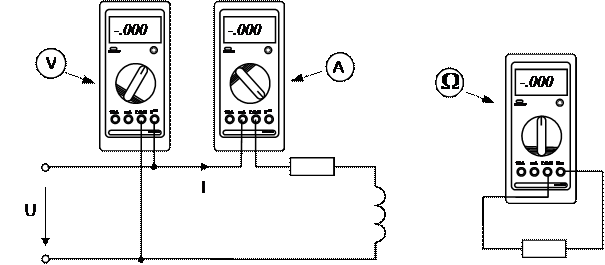 До подключения мультметра к цепи необходимо выполнить следующие операции: · выбор измеряемой величины: - V, ~ V, - A, ~ A или W; · выбор диапазона измерений соответственно ожидаемому результату измерений; · правильное подсоединение зажимов мультиметра к исследуемой цепи. Присоединение мультиметра как вольтметра, амперметра и омметра показано на рис. 1.5.