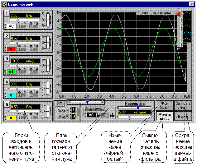 В правом верхнем углу осциллографа (рис. 1.13) имеется движок управления степенью сглаживания фильтра (появляется только при его включении), а также меню изменения характеристик графика: непрерывный, ступенчатый, гистограмма, точечный, размер и форма точек, толщина линий и т.п. Меню открывается при щелчке на любом из изображенных там пяти лучей