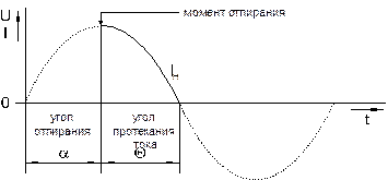 Фазовое управление тиристора При фазовом способе управления на управляющий электрод тиристора подаются короткие импульсы напряжения, отпирающие тиристор в определенной точке полуволны приложенного напряжения. Запирается тиристор автоматически в момент перехода тока через ноль. Изменение точки (фазового угла) отпирания приводит к изменению среднего за полупериод значения тока нагрузки (рис. 6.3.1).