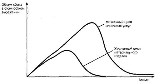 Более того, мировая практика диктует производителю, чтобы он нес ответственность за организацию сервисного обслуживания не только выпускаемых, но и снятых с производства видов техники и оборудования на протяжении всего срока их службы вплоть до утилизации. В странах Европейского Союза активно обсуждается вопрос о том, чтобы законодательно возложить ответственность за утилизацию автомобилей на компании-производители. Графически различия в кривых жизненного цикла товара и цикла сервисных услуг представлены на рис. 2.4 [121, с. 33]. До сих пор проблема жизненного цикла услуг не изучалась так глубоко и качественно, как проблема жизненного цикла товара (ЖЦТ). В результате большинство предпринимателей применяют методы управления ЖЦТ в неизмененном виде к управлению жизненным циклом услуг. Но ведь в то время, когда товар находится на этапе зрелости, жизненный цикл сервисных услуг только набирает обороты. Как показывает практика, создание эффективной системы управления жизненным циклом сервисных услуг — длительный и трудоемкий процесс, затрагивающий всю фирменную культуру.