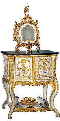 В период расцвета «елизаветинского барокко начала формироваться обстановка парадных комнат, в состав которой традиционно входили золоченые или посеребренные консольные столики, стулья, кресла, канапе, торшеры и зеркальные рамы. Они традиционно снабжались изящно изогнутыми ножками. В середине XVIII века, помимо золочения, в моду вошла раскраска мебели – белая или цветная. Иногда фон и резьба красились в два тона, гармонируя с нарядной вышитой или штофной обивкой. Мебель отличалась большей утонченностью пропорций и изяществом контуров. В предметах мебели с преобладанием барочных черт объемная резьба часто покрывалась сплошной позолотой, а асимметричный растительный декор нередко соседствовал с аллегорическими элементами.