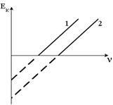 Исходим из уравнения Эйнштейна для фотоэффекта: Исходя из последней формулы и графика функции, делаем следующие выводы: - при одинаковой частоте кинетическая энергия может быть различной только при различных работах выхода, что возможно только при исследовании двух различных металлов, на работу выхода не влияет освещенность металла; - из формулы видно, что чем больше значение работы выхода электрона из металла, тем меньше значение кинетической энергии; - в уравнение входит в качестве параметра значение постоянной Планка, которое является постоянным множителем при параметре ν, следовательно, именно постоянная Планка определяет угловой коэффициент графика функции. Выводы: - - угол наклона зависимостей 1 и 2 одинаков.
