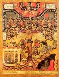 Но уже с древности солнце изображалось, как крест в круге (Рис.5). Ведь это самое простое изображение. Его мы можем видеть на многих предметах старины: резьбе (Рис.6), вышивках и т.д., и даже сегодня мы — не случайно, а по древней памяти! — так изображаем свет (огни, лампочки) на схемах и чертежах. Кроме солярного (солнечного) смысла крест с удлинённым нижним лучом символизировал собой ещё и стилизованное изображение "Мирового древа", что тоже видно на резьбе и вышивках наших далеких предков, на старохристианских крестах (Рис.7), старых иконах (Рис.8), на лепнине храмов (Рис.10) или средневековой западно-европейской гравюре "крестного дерева". (рис. 9). Также похож на крест раскинувший руки человек (как на древнем "идоле", Рис.11) и многое другое, встречающее в окружающем мире, т.е. символ креста — в полном смысле Природный символ, солнечное (солярное) значение которого, конечно, главное.
