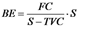 FC - постійні витрати; P - ціна одиниці продукції; VC - змінні витрати на одиницю продукції. Точка беззбитковості в грошовому вираженні: