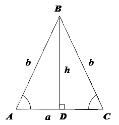 1. Основа – АС, бічні сторони рівні: АВ = ВС, кути при основі рівні: Ð А = Ð C. 2. Властивість рівнобедреного трикутника: ви-сота, проведена до основи є медіаною і бісек-трисою: ВD – висота, АD = DС, Ð АВD = Ð DВC. 3. Периметр трикутника: 4. Формули для знаходження площі трикутника: