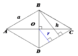 1. Ромб – це паралелограм, в якого всі сторони рівні, 2. Діагоналі ромба перетинаються під прямим кутом і є бісектрисами його кутів. 3. Периметр ромба 4. Площа ромба 5. У ромб можна вписати коло, центр кола – точка перетину діагоналей, 6. Навколо ромба не можна описати кола.