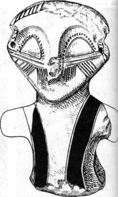 Рис. 3-19 Богиня-птица в маске с клювом, Винча, (1) начало Утыс. до н.э., (2, 3) середина Утыс. до н.э. Статуэтки культуры винча, в особенности изображения Богини-птицы, представляют ряд ценных деталей: характерную безротую маску с большим носом или клювом (рис. 3-19 и 3-20); такие детали туалета, как лямки (рис. 3-20), набедренные ремни или узкие юбки (см. рис. 7-87 и 7-89-7-94), а также вырезанные или нарисованные символические обозначения божественности — знаки в виде «V», шевроны, волнистые, параллельные, двойные и тройные линии (см. рис. 7-14). В некоторых случаях изображения Богини-птицы появляются на горлышках сосудов (см. рис. 7-17) или прикрепляются к ним в качестве маски (рис. 3-19.2). Птицеобразные сосуды с человеческими масками можно считать настоящими шедеврами этого искусства. Маски характерны для всех скульптур с ясно выраженными чертами кото-рые представляют божественных существ. У Богини-птицы и других богов классического периода культуры винча лица закрыты пятиугольными масками с полукруглыми глазницами (рис. 3-19 и 3-20). У поздних скульптур культуры винча глазницы имеют миндалевидную форму (рис. 3-21). На плоских частях маски вырезали символические знаки. Крупные маски в натуральную величину были найдены в Южной Югославии (цветная вклейка 11). Среди скульптур преобладают изображения Богини-птицы; это позволяет предположить, что именно она была главным божеством, которому поклонялись в святилищах культуры винча. Однако встречаются изображения и других божеств - богинь в образе змеи, мадонн (матерей с младенцами на руках, в медвежьей или птичьей маске: см. рис. 7-5 и 7-6). Около 20% статуэток составляют зооморфные фигурки - змеиные, лягушачьи, ежиные, песьи и рыбьи - и антропоморфные фигурки мужчин в бараньих или козьих масках. Чрезвычайно любопытны обнаруженные в Южной Югославии кентавры с человеческой головой, лицом-маской и туловищем быка (цветная вклейка 22). Ха-