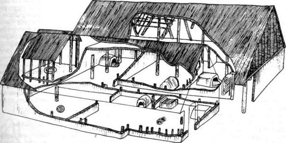 Рис. 3-24 План и реконструкция дома. Стены в комнате с боковым входом и самой большой печью (справа в углу) были внутри и снаружи украшены полосами нарезного орнамента в виде меандров и окрашены в красный цвет. Горжа, Юго-Восточная Венгрия, классический период культуры тиса, ок. 4500 г. до н.э. Гимбутас М. Цивилизаця я Великой Вт