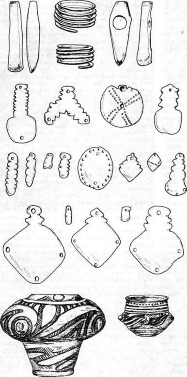 Рис. 3-86 Карбунский клад: медщп резец, наручные браслет топор и подвески из мед пластин, найдены в rpyi видном сосуде с крыши! (нижний рисунок). Мода] вия, приблизительно XLV1 ХLVвв. до н.э. Масим подвески 1:1, все проч 1:3.