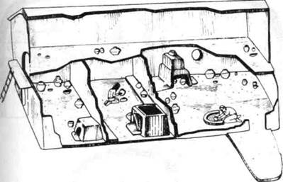 Рис. 3-87 Рис. 3-87 Реконструкция керамической мастерской из Варва-ровки VIII, Молдавия. Возможно, что это была храмовая мастерская, причем святилище располагалось на втором этаже. Приблизительно 4000 г. до н. э.