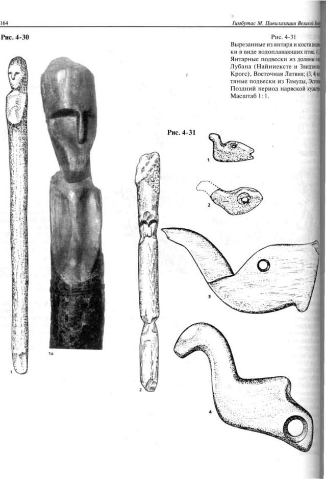 Некоторое представление о религиозных обрядах и молах дают большие деревянные шесты, увенчан- I ные резными изображениями человеческих головс совиными чертами: возможно, что это — изображения Богини в виде совы (рис. 4-30). Кроме того, сюда же относятся костяные подвески в виде водоплавающих птиц (рис. 4-31), деревянные ковши в форме уток, гусей, журавлей и других водоплавающих (рис. 4-32), змей, а также изумительные резные посохи из оленьего рога, с одного конца увенчанные головой лосихи (см. рис. 7-3). Янтарь: обработка и торговля Сбор и обработка янтаря имели самый широкий размах; археологам удалось обнаружить мастерские по обработке янтаря вдоль Балтийского побережья и даже в нескольких сотнях километров от моря. Из него изготовлялись цилиндрические бусины, круглые пуговицы с У-образной перфорацией, антропоморфные подвески (рис. 4-33), скульптурные изображения водоплавающих птиц, лосей и медведей. За эти янтарные подвески и пуговицы жители Северо-За-