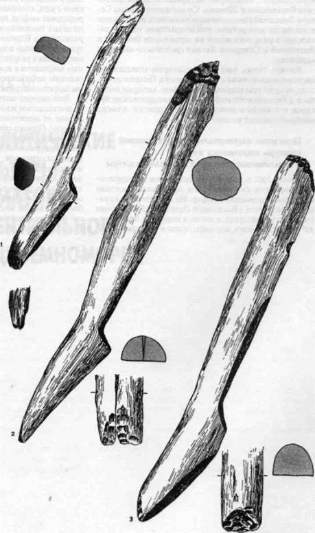 Рис. 4-32 Деревянные ручки для ковшей в виде лебедя или гуся и полевого луня. (1) Сарна-те; (2) Швянтойи; (3) Сар-нате. Ок. 3500-3000 гг. до н.э. Масштаб: (1, 2) 1:1; (3) 1:2.