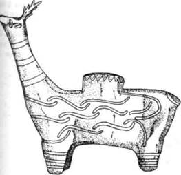 Рис. 7-3 Рис. 7-3 Священное животное Богини в ипостаси роженицы — олень, чьи изображения встречаются часто и достигают высокого уровня исполнения. Этот зооморфный сосуд, использовавшийся как лампа при совершении связанных с рождением ритуалов, свидетельствует о наличии связи между оленем, месяцем или змеей и узором из тройных полос. Белая роспись на красном фоне. Культура ка-раново I, Мулдава, Центральная Болгария. Начало VI тыс. до н. э.; высота ок. 50 см (от копыт до кончиков рогов).