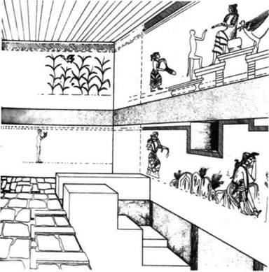 Рис. 7-8 Приблизительная реконструкция целой комнаты храма в Ак-ротири, о. Тира. Стенная росписью втором уровне представит «Владычицу животных», а нижняя роспись, — возможно, шой-то инициационный об-ри.XVI I. дд о.э. Рис. 7-8