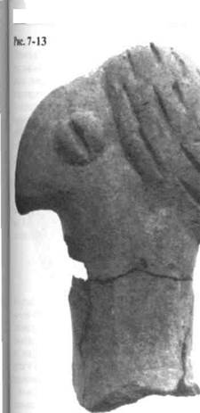 Рис. 7-19 Антропоморфный сосуд син вом и женской грудью (в ш дой груди по отверстию в ш стве поильника), расписании белыми зигзагообразными™ лосами и параллельными л ниями; могильник Мант Восточный Крит. Ок. кош II тыс. до н.э.; высота 16 4о Рис. 7-20 Камни с вырезанными на и схематическими фигурамияй цевидными ягодицами и, г правило, без головы (если н есть, то птичья), помеченни одной, двумя или более Л1 ми. Ла-Рош, Лалэнд, Дордои Южная Франция. Эпоха лен IV, ок. 10000 г. до н...