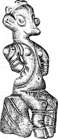 Рис. 7-14 Рис. 7-14 Богиня-птица в утиной маске и в короне; поздний период культуры винча. Она восседает на троне с резьбой ввидетрехлиний,на ней короткая курточка; ее таз — или передник — украшен шевронами, колени — спиралями, а ноги ниже колен — витыми линиями. Светозарево, Центральная Югославия. Ок. 4500 г. до н.э.; высота 16 см. Рис.7-16