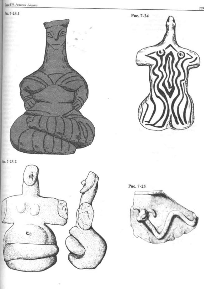 Рис. 7-24 Богиню-змею можно узнать по змеевидной форме га вы или по нарисованным на ее теле волнистым (змей1 тым) линиям, символам жизненной влаги («Кундалига Красная роспись на кремовом фоне. Анатолийский! олит, точное место обнаружения неизвестно. Beposrn ок. 6000—5500 гт. до н. э.; высота 10 см.