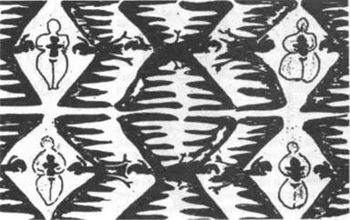 можно наблюдать гибридное сочетание птичьих и женских признаков. Так, женские ягодицы идентифицируются с вытянутой частью птичьей тушки или же с птицей, несущей яйцо. Подобно яйцу, ягодицы обладают особой силой генерации. На них бывают вырезаны или нарисованы змеи, спирали, концентрические круги, кресты, вихревые знаки, а также мотив из двух «С» в противофазе, еще один из жизнестимулирующих символов. Необходимо отметить, что эти любопытные гибриды женщины и птицы как правило не имеют гov-ди, что подчеркивает особое значение ягодиц. В данном случае на первый план выходит производи-тельная функция заслоняя собой вскармливание. Змея и Богиня-змея Змея, в первую очередь, — образ витальности и продолжительности жизни, гарант жизненной силы в доме, символ семьи и животного существования. Мы можем реконструировать символическое значение змеи, исходя не только из доисторических изображений Богини-змеи и ее культа в качестве домашнего божества, но и опираясь на архаические народные представления о силе змей обоего пола. Например, в Литве даже в XX в. сохраняется поверье, что если убить обитающую в доме зеленую змейку, то это приведет к смерти одного из членов семьи15. До недавнего времени русские и другие славяне верили в существование домового хранителя домашней жизни и благополучия который порой имел облик змеи порой - ь*ужич-ка: в нем жил дух прародителя рода Сотни греческих и римских рельефов и рисунков подтверждают что хранителями дома были зеленые храншелями димд иыли зеленые 1МРИ КОТОПЫР r Г прпии НООИПИ ИМЯ Зевса Ктесиоса, а в Риме называ- -Гтись гтенэтэ/ми Обозз змеи тесно РЙ я ЧЯН С" ТТПИПОП1-1К1М JT и KTlfYkf f*\f^n- ти^возрождения Ее зимняя спяч-кГнаГпоминает смеоть а смена кожиi-своего рода^ссмертиГне Рис. 7-22