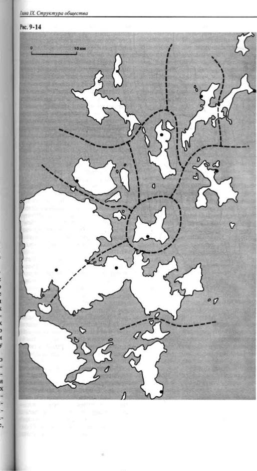 - поселение - небольшой каирн (центр первого порядка) большой каирн (центр второго порядка) - хендж (центр третьего порядка) Рис. 9-15 Пространственная стратификация на Оркнейских островах эпохи неолита (упрощенная реконструкция Д.Фрейзера). на всем протяжении их активного использования нет никаких признаков того, что они были связаны с институтом правителей индоевропейского типа. Теория автономных поселений-ячеек с примерно одинаковым числом жителей приложима лишь к раннему периоду их существования до середины IVтыс. до н.э. Приблизительное 3500 г. до н.э., когда численность населения начинает возрастать, появляются группы поселений с определенной мерой формальной организации (пространственной стратификации), которая включала в себя большие мегалитические конструкции, камерные гробницы с каменными насыпями и гигантские хенджи, — что указывает на расширение и усложнение структурных элементов общества. Некоторая ясность в вопросе распределения крупных и небольших гробниц была достигнута на Оркнейских островах, где в последние десятилетия велись интенсивные археологические изыскания. На карте островов отмечено 10 камерных гробнице каирнами (гробниц, покрытых насыпью из камней), объем которых превышает 340 кубических метров (рис. 9-14). Они сильно рассредоточены, и две крупные насыпи никогда не стоят слишком близко друг к другу. Было замечено, что на группу островов или на участок территории, который представляет собой естественную топографическую единицу, приходится одна насыпь больших размеров46. Небольшие насыпи располагались неподалеку от поселений: по-видимому, они служили центрами для отдельных общин. Что касается больших насыпей, то они сKODce всего возводились и использовались жителями нескольких окрестных общин а огромные хенджи выполняли такую же функцию для всего населения Оркнейских островов, Реконструкция этой сложной системы организации общества гшедложена на рисунке Д Фпейзеоа (оис 9-15) Согласно его ин^ пи бкити пячгнпй чягтктп пгтгрпнринпй \ жи иыли вчжнин час ыи ииткеднеинш ки к определенном^месту Хенджи | [зава IX. Структура общес тва