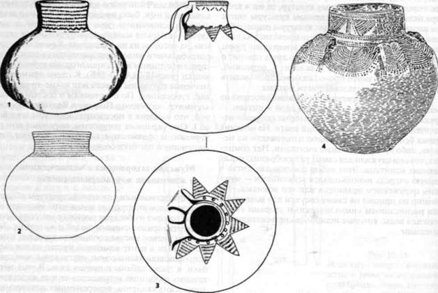 (1) Воловья упряжка (слева), захороненная рядом с каменной цистой с человеческими скелетами (справа). Здроевка, район г. Коло, Польша. (2) Костяная пластина с выгравированным звездным мотивом первоначально была закреплена налбуубыка. Бжесць-Куявски, район г. Влоштвек, Польша; диаметр 8 см. Рис. 10-27 Шаровидные амфоры, украшенные шнуровыми оттисками. Польша и Нижнедунайский бассейн. (1) Кальск, район г. Све-бодзин, Польша; (2) городище Михайловка I, Нижний Днепр; (3) Стжельце, г. Могильно, Западная Польша; (4) Ренбков-Парцеле, г. Гарволин, Польша. Вторая половина IV тыс. до н.э. Масштаб ок. 1:4. Рис. 10-28А Погребальный инвентарь из каменной цисты культуры шаровидных амфор. (1) Лежащий на левом боку в скорченной позе мужчина снабжен (2) топором из полосчатого кремня и (3— 6) четырьмя горшками. Пши-быслав, район г. Иновроштав, Западная Польша; высота кувшина (слева) 28 см. Рис. 10-28А