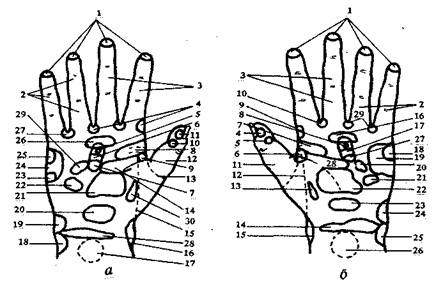 Рис. 23. Топография рефлексогенных зон на руке человека: а (правая кисть): 1 — околоносовые пазухи; 2 — слух; 3 — нервная система; 4 — зрение; 5 — тимус; 6 — надпочечники; 7 — почка; 8 — желудок; 9 — глотка, гортань; 10 — эпифиз; 11 — гипофиз; 12 — головной мозг (психическая сфера); 13 — шея; 14 — ободочная кишка; 15 — позвоночник; 16 — половые органы; 17 — пояснично-крестцовая область; 18 — яичко; 19 — суставы нижней конечности; 20 — мочевой пузырь; 21 — кишки; 22 — а ппендикс; 23 — желчный пузырь; 24 — печень; 25 — суставы верхней конечности; 26 — легкие; 27 — уши; 28 — геморроидальные узлы; 29 — поджелудочная железа; 30 — щитовидная железа; б (левая кисть): 1 — околоносовые пазухи; 2, 3 — нервная система; 4 — гипофиз; 5 — эпифиз; 6 — глотка, гортань; 7 — желудок; 8 — тимус; 9,10 — зрение; 11 — головной мозг (психическая сфера); 12 — позвоночник; 13 — щитовидная железа; 14 — геморроидальные узлы; 15 — половые органы; 16 — легкие; 17 — надпочечники; 18 — суставы верхней конечности; 19 — сердце; 20 — поджелудочная железа; 21 — селезенка; 22 — кишки; 23 — мочевой пузырь; 24 — суставы нижней конечности; 25 — яичко; 26 — пояснично-крестцовая область; 27 — почки; 28 — ободочная кишка; 29 — уши