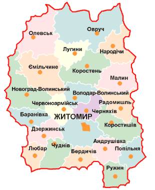 мирська область розташована в центральній частині Східно-Європейської рівнини, на півночі Правобережної України. Площа області становить 29,9 тисяч квадратних кілометрів, що складає 4,9% території України. За своїми розмірами область одна з найбільших на Україні і поступається лише перед Одеською, Дніпропетровською, Чернігівською та Харківською областями. Протяжність області із заходу на схід сягає 170 кілометрів, а віддаль з півночі на південь дорівнює 230 кілометрів. За конфігурацією область являє собою багатокутник. Область має вигідне економічно-географічне положення, що сприяє розвитку її продуктивних сил і активній участі в територіальному поділі суспіл. Житомирська область відноситься до одного з найбідніших на природні ресурси регіонів. Область багата на лісові та земельні ресурси, що й визвало її аграрно-сировинну спеціалізацію.Основу економіки регіону складають сільське господарство, переробка сільгосппродукції, а також будівельна індустрія, яка базується на місцевих покладах сировини. За темпом приросту основних економічних і соціальних показників Житомирщина займає 5 місце серед усіх регіонів. 1.2 Природні умови та ресурси Клімат помірно континентальний, з м'якою зимою (середня температура січня -5°С, -6°С) і теплим вологим (середня температура липня +18°С, +19°С) літом. Кількість опадів, більша частина яких припадає на літній період, становить 510-600 мм на рік. Північна частина території області розташована у межах пологохвилястої, покритої сосново-березовими лісами і місцями заболоченої Поліської низовини, південно-західна — у межах підвищеної Придніпровської височини, з густою мережею досить глибоко врізаних долин річок, балок та ярів. Абсолютні висоти над рівнем моря становлять 150-280 м, а максимальні — до 316 м (Словечансько-Овруцький кряж, що піднімається над Поліською низовиною на півночі області). Ріки Житомирщини — Тетерів, Случ, Уж, Уборть та ін., прорізуючи древні кристалічні породи, створюють надзвичайно мальовничі ландшафти, що є природною візитною карткою обласної праці. Область багата на природні ресурси. Мінерально-сировинний потенціал представленний облицювальним каменем, мармуром, самоцвітами, сировиною для металургії та будівельної промисловості, вапняками, бурим вугіллям, торфом. Розвідані запаси лужних каолінів, їх обсяги і кількість дозволяють виробляти до 0,5 млн. тонн польовошпатних концентратів на рік. Є запаси будівельних пісків, пірофілітових сланців, керамічних глин і ряду інших видів мінеральної будівельної сировини. Запаси декоративно-облицювального каменю (лабрадорит, граніт, габро), що користується великим попитом у нашій країні та за кордоном, практично не обмежені. Розвідані поклади лабрадоритів і габро в області становлять 86% запасів цього каменю в Україні. Це визначає необхідність прискореного розвитку каменедобувної і каменеобробної промисловості. Перспективним є родовище мармуру, що має рисунок надзвичайної краси, добре полірується. Це чудова сировина для виробництва облицювальної плитки, мармурової крихти, смолодоломитів для металургії, різних видів флюсів та наповнювачів, а також мінеральних добрив. На території області ведеться видобуток кольорового напівдорогоцінного каміння – берилу, топазу, кварцу з подальшою його переробкою та виготовленням ювелірних вироб
