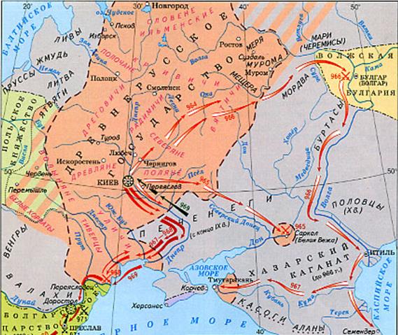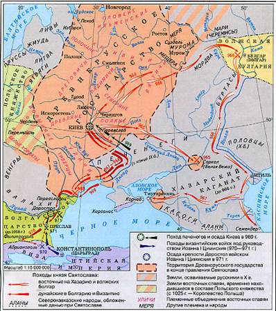 (на Хазарию и волжских болгар, дунайские походы против Болгарии и Византии). Поход печенегов и осада Киева в 969 году. Походы византийских войск под предводительством Иоанна I.