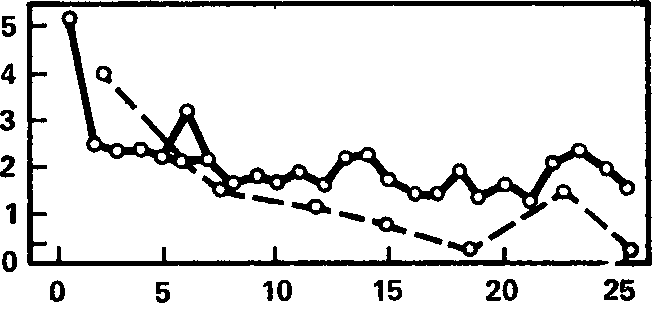 Рис. 5. Сопоставление динамики реакции десинхронизации при сочетаниях звука со светом (сплошная линия) с динамикой этой реакции при изолированных предъявлениях условного звукового раздражителя (штриховая линия). Ось абсцисс – порядковый номер сочетаний; ось ординат – длительность реакции десинхронизации (в с).