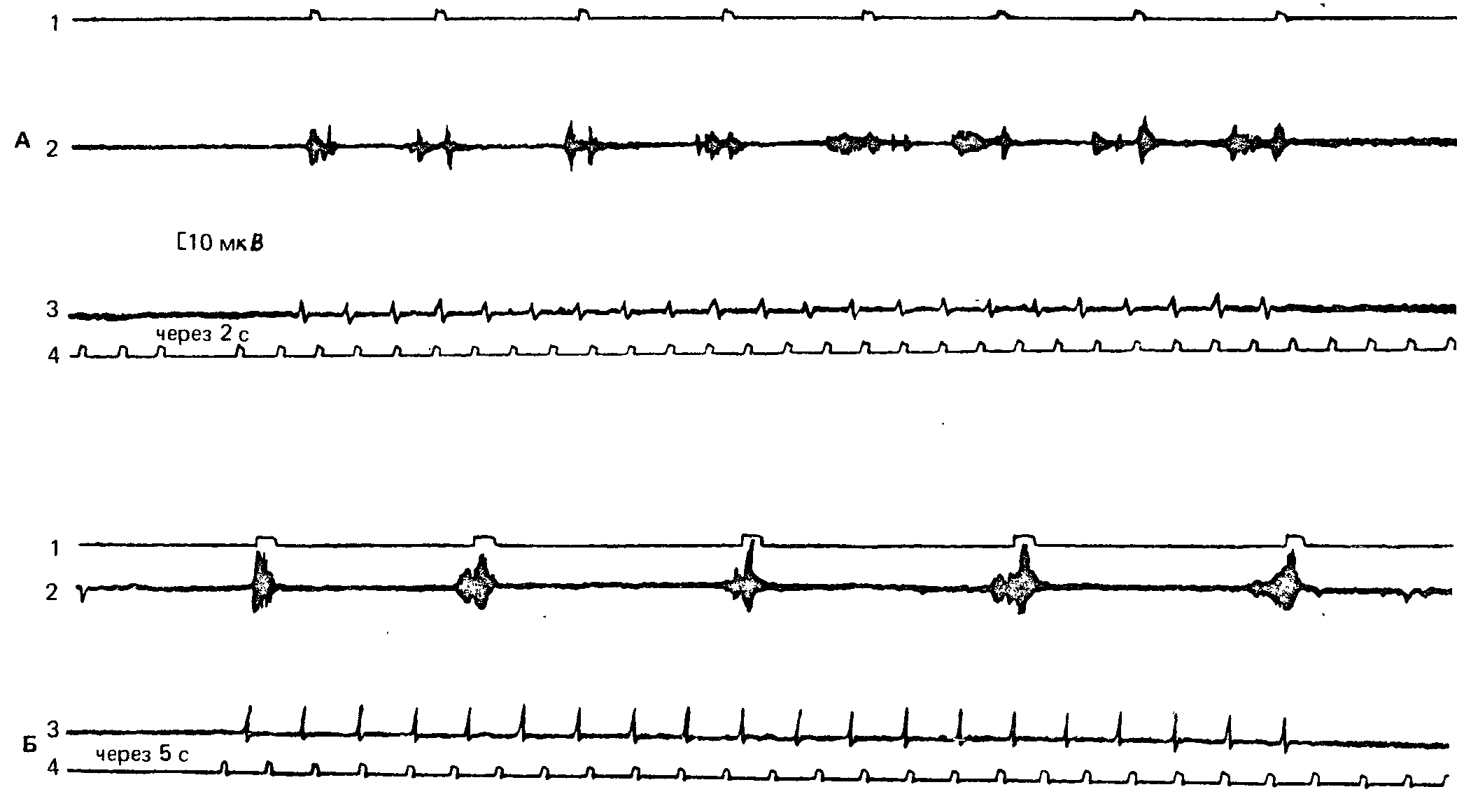 Рис. 12. Электромиографическая активность сгибателей кисти у двух испытуемых с малой динамичностью тормозного процесса: А – при чередовании одного положительного сигнала с двумя тормозными; Б – при чередовании одного положительного и пяти тормозных сигналов. 1 – отмегка положительной реакции, 2 – ЭМГ, 3 – отметка световых сигналов, 4 – отметка времени (1 с) (А.Я. Колодная, 1961).
