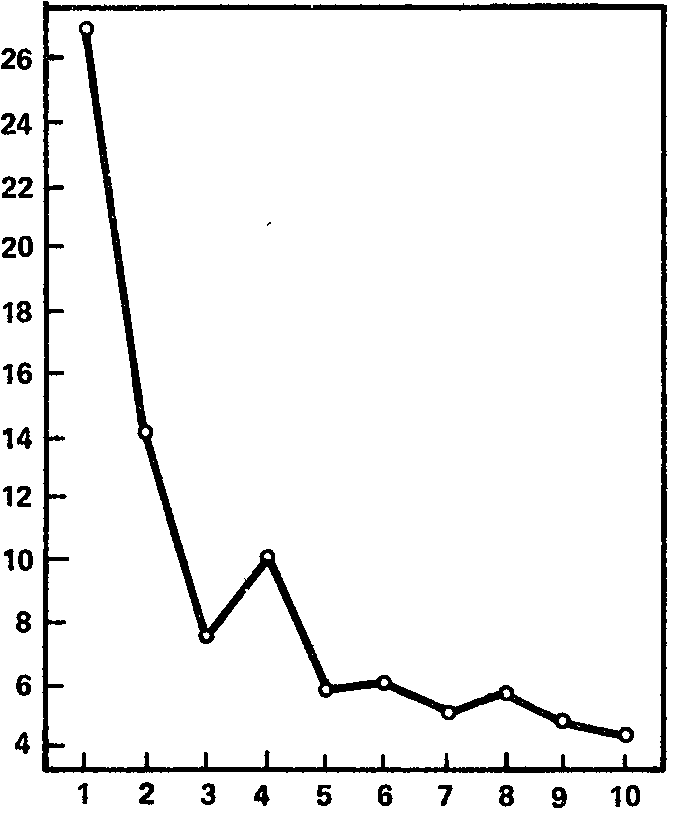 Рис. 16. Динамика ориентировочной электрокорковой реакции на свет (в среднем для всей выборки). Ось абсцисс – порядковый номер светового раздражителя; ось ординат – длительность реакции десинх-ронизации (в с).