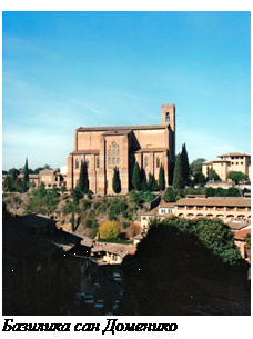 Ближайшая к автовокзалу достопримечательность - базилика сан Доменико. Не поразила чем-то, но мимо точно не стоит проходить. Тихо, спокойно. В Риме не так, хотя там есть более шикарные базилики. Рядом с базиликой сан Доменико с небольшой площадки очень хорошие виды. Почти весь старый город как на ладони. Выделяются на фоне остальной застройки Домский собор и 102-метровая башня (Торре-дель-Манджа), которая примыкает к ратуши (Palazzo Pubblico). Если направляться к площади дель Кампо от базилики сан Доменико, то карту на время можно убрать. Хорошим ориентиром служит башня Манджа. Можно идти и на колокольню Домского собора. Она также достаточно высока и поэтому видна из разных точек города. К ней сначала и направился. К Сиенскому собору (Дуомо) подошел с тылу, но он выглядит торжественно даже с этой стороны. Сначала даже не понял, почему почти нет людей у входа, а дверь не очень большая. Обычно у подобных объектов скапливается много туристов. Они и были, но с противоположной стороны. Я двигался к собору не по той тропе, по которой обычно перемещается от достопримечательности к достопримечательности большинство туристов.