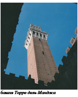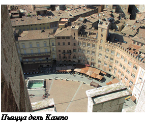 После покорения различных возвышенностей города и хождения по музеям приятно полежать в раковине — на мощенной Пьяцца дель Кампо. Там находят возможность отдохнуть в почти горизонтальном положении многие туристы. В солнечную погоду можно даже позагорать. Ни башня Манджа, ни общественный дворец (ратуша) солнечные лучи не преграждают, но украшением отдыха служат. Таких мест, где нет теней от близстоящих зданий, в Сиене немного, а с таким большим открытым пространством, как на центральной площади (Пьяцца дель Кампо), вовсе нет. По краю площади множество кафе, имеющие столики на улице, но лучше съесть мороженое, усевшись на подогретой солнцем и чистой плитке, если еще можешь сам с нее подняться и не чувствуешь себя слишком солидным. Прямо на Пьяцца дель Кампо туристам, экономящим на ресторациях, даже позволительно организовать более полноценное питание из яств, которые они носили весь день в рюкзачке.