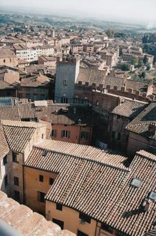 Вся старая Сиена раскрашена в спокойные коричневые цвета (большинство зданий в пределах городской стены построены из местного красно-коричневого кирпича). В этом городе не только неплохо сохранились средневековые здания, но и фасады домов выглядят менее обшарпанными по сравнению с Римом, Флоренцией, Венецией. Судя по всему, многие дома вообще не имеют штукатурки и покраски. Используемые строительные материалы позволяли обходится без них. Потому и облупливаться было нечему. Мощенные гранитом улочки вьются по холмам. Ровных мест в старом городе вообще очень мало. Даже главная площадь (Пьяцца дель Кампо) имеет из-за этого форму раковины. Подобный ландшафт еще более придает городу сказочный вид.