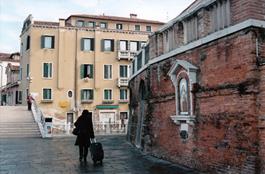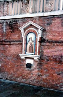 Церковь «босоногих» обнаружил уже перед отъездом на пути к вокзалу. Сначала же при прибытии в город с возникшим при этом праздничным настроением пересек изящный и кажущийся невесомым мост Скальци через Большой канал, который делит историческую часть города пополам буквой S. Затем вырвался из потока туристов, устремленного по указателям к площади и собору Сан Марко. Если почти все пошли прямо после моста, то я повернул направо, чтобы посмотреть сначала не совсем парадную Венецию. Впрочем, в исторической части города таковой почти нет. Хоть с большинства домов и слетел лоск, все равно в Венеции даже в самых отдаленных от туристских троп закоулках может быть интересно. Недалеко от вокзала на противоположной от него стороне Большого канала наткнулся на икону, от которой в разгар солнечного дня становилось еще светлее. Она встроена в совсем уж неприглядный забор из грязного и слегка побитого красного кирпича Этот забор служит ограждением для сада Giardino. К сожалению, ничего об этой иконе в Сети не нашел. Судя по всему, она служит напоминанием, что на месте сада когда-то была церковь Санта-Кроче (Santa Сгосе, Святой крест). От этой церкви почему-то осталось только название, которое перешло на весь район, в котором она находилась.